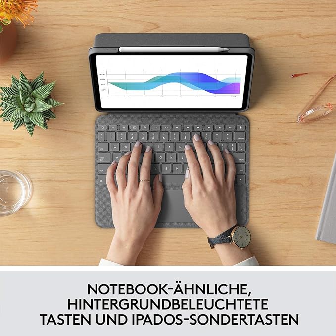 Die Tastaturhülle verfügt über eine präzise Tastatur mit Hintergrundbeleuchtung, die ein komfortables Tippen auch bei schlechten Lichtverhältnissen ermöglicht. Das integrierte Trackpad bietet eine einfache und intuitive Navigation durch Ihr iPad, sodass Sie Ihre Arbeit noch effizienter erledigen können.