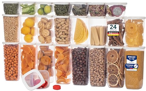 Das Set enthält 24 Vorratsdosen in verschiedenen Größen, von kleinen Behältern für Gewürze und Kräuter bis hin zu größeren Dosen für Mehl, Reis, Nudeln und andere trockene Lebensmittel. Die transparenten Deckel ermöglichen es Ihnen, den Inhalt der Dosen leicht zu erkennen, ohne sie öffnen zu müssen.